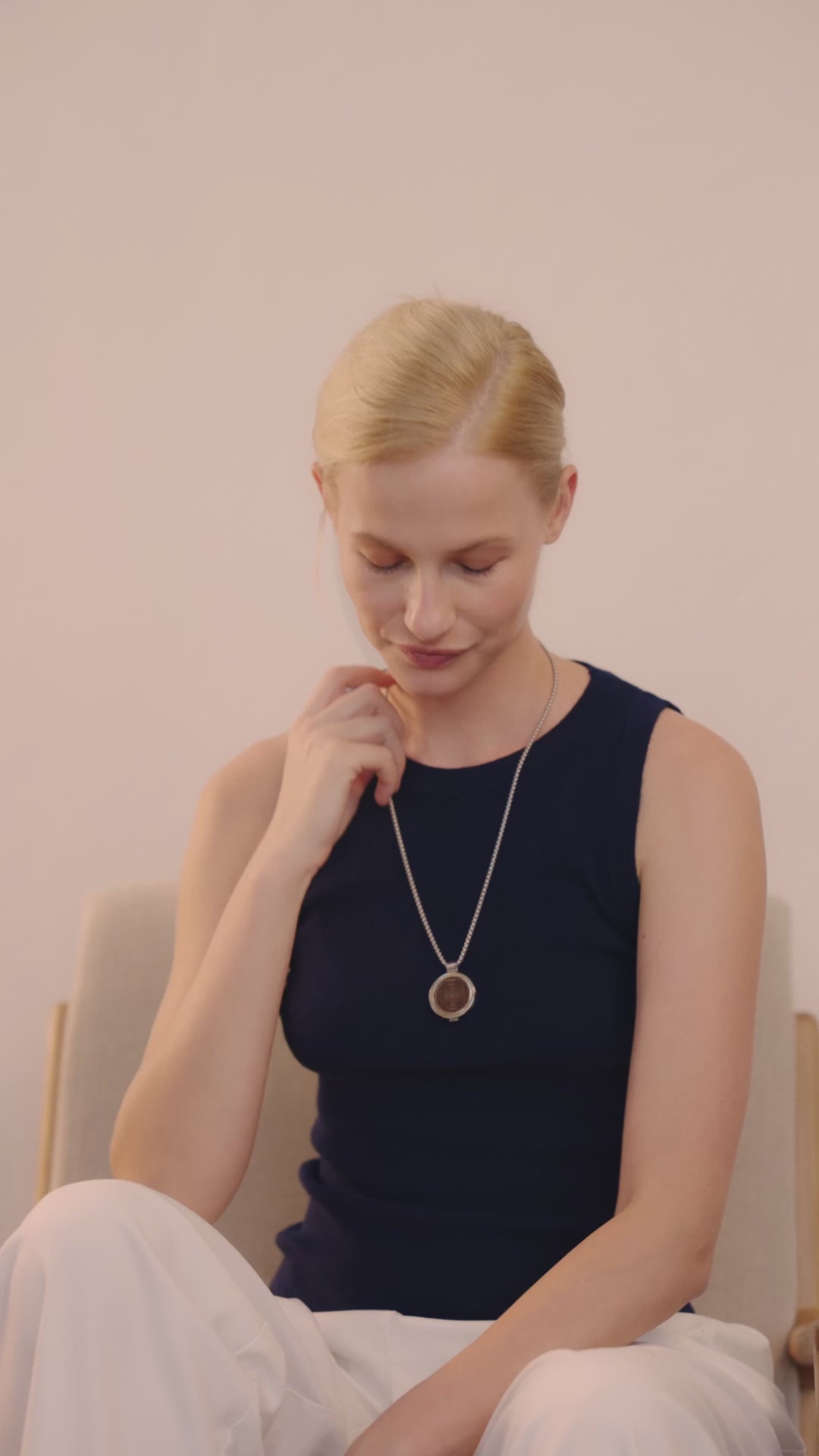 Frau im Innenraum trägt die ProEnergetic KIER Protect Necklace mit schwarzem Lederband und rundem Anhänger sichtbar am Hals